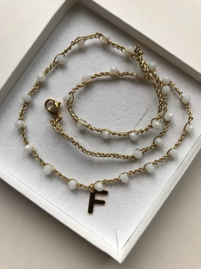 Personalisiertes, handgefertigtes Schmuckstück, komplett handgehäkelt mit goldfarbenem Faden und verflochtenen kleinen Kristallen. Initialenanhänger aus vergoldetem Stahl. Verschluss aus vergoldetem Stahl, Länge des Halsbandes ca. 42 cm.