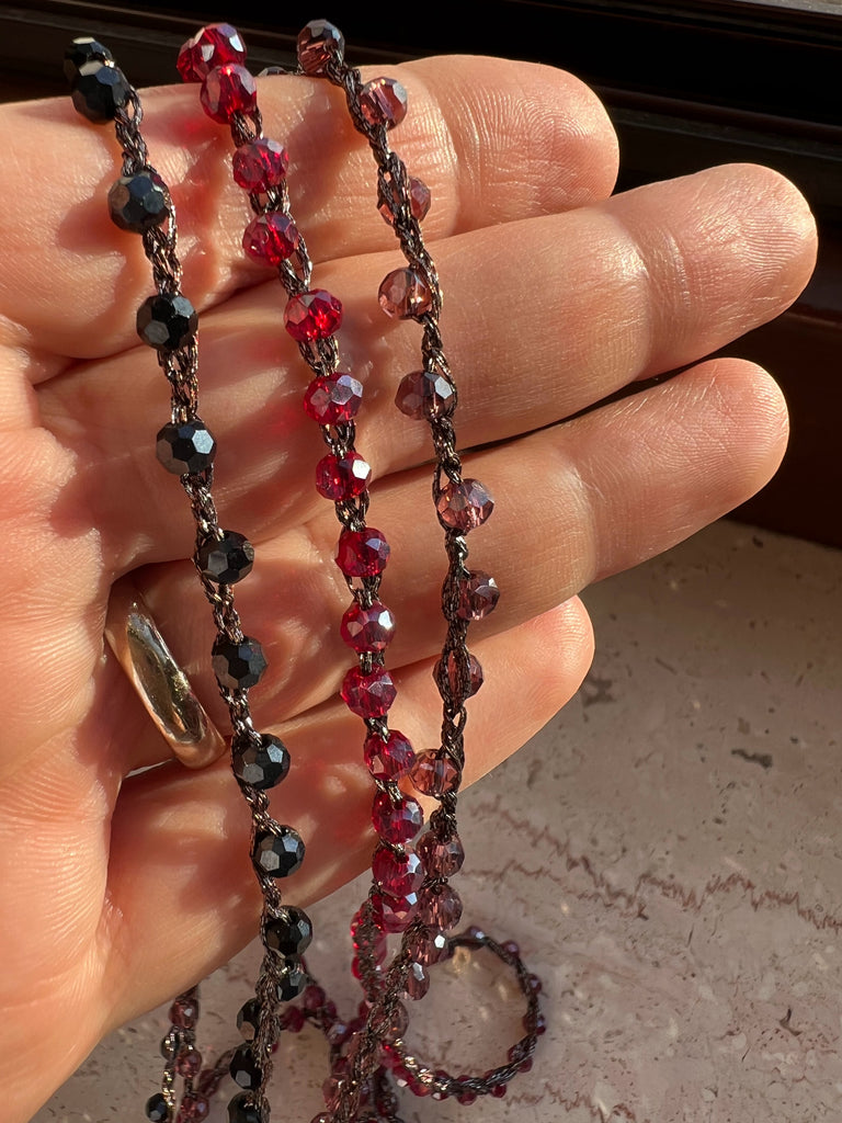 Materiali utilizzati: filato gioiello, cristalli di vetro, perline di vetro. Ogni gioiello è realizzato a mano, e può presentare leggere variazioni che lo rendono unico.