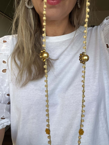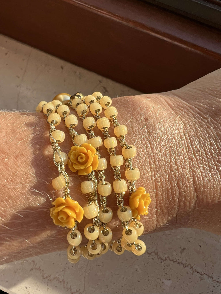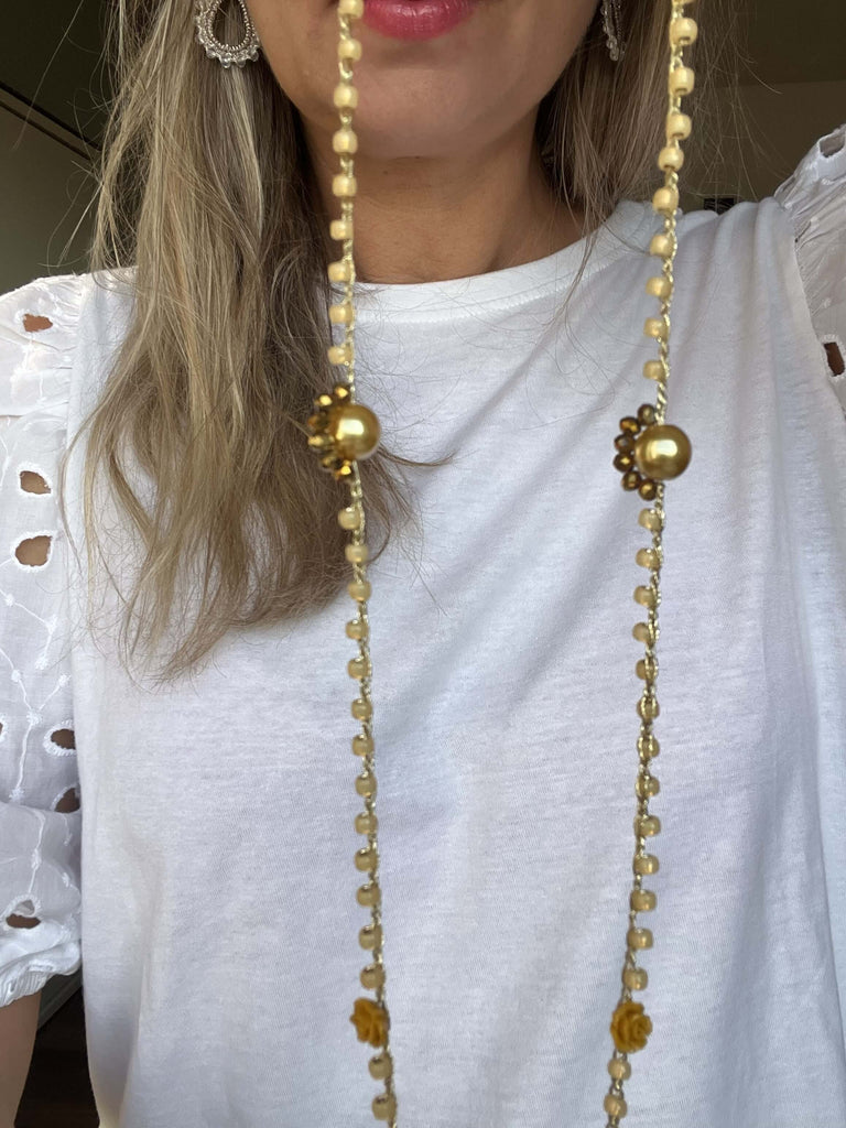 Realizzata interamente a mano con perline Toho giapponesi color senape e miele, perle di vetro ceco Bohemia, filo gioiello italiano e pietre semipreziose selezionate. Nessuna plastica, solo materiali naturali e raffinati che rispettano la pelle e l’ambiente.