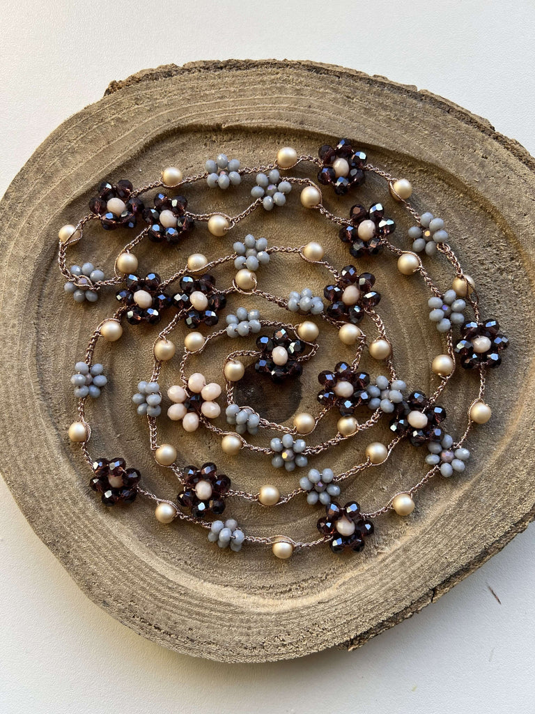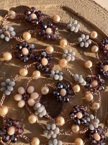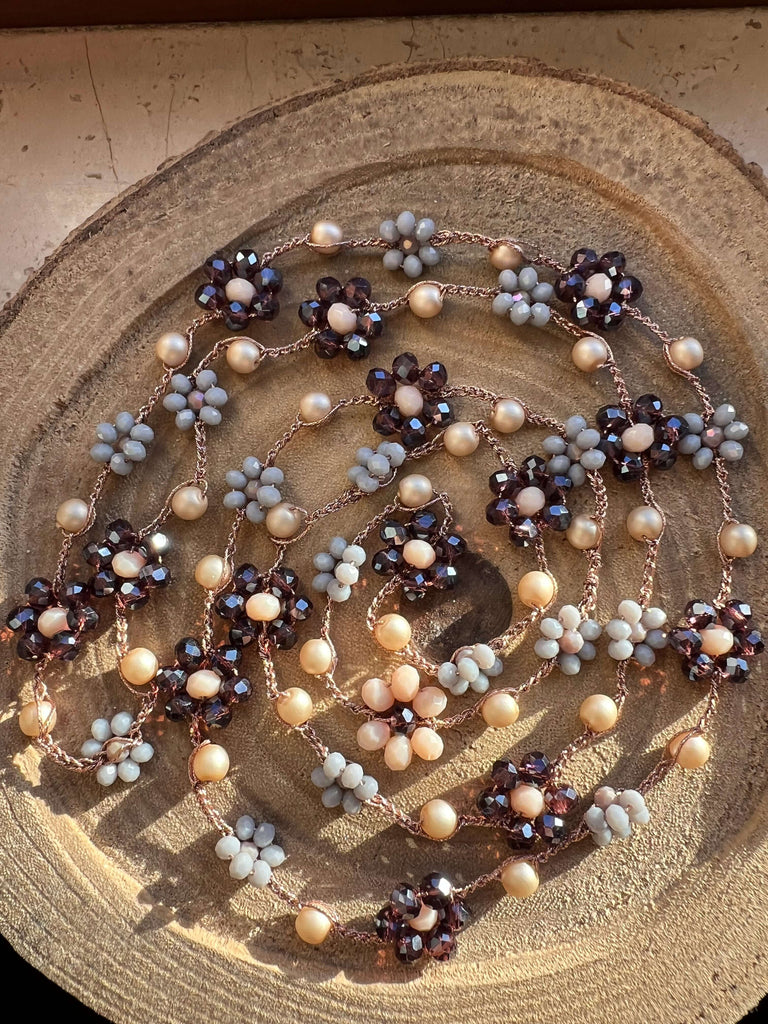 Lasciati incantare da Viola Cenere, una collana handmade in crochet che intreccia la poesia dei fiori viola e grigio con la luce delicata del filato oro rosa.